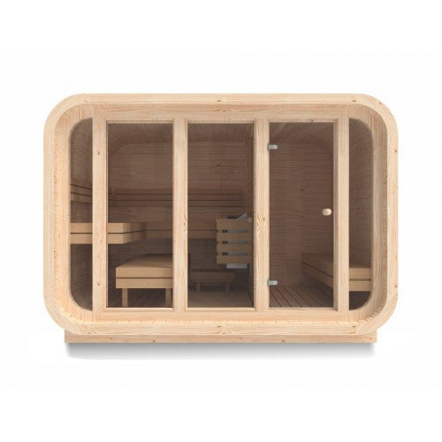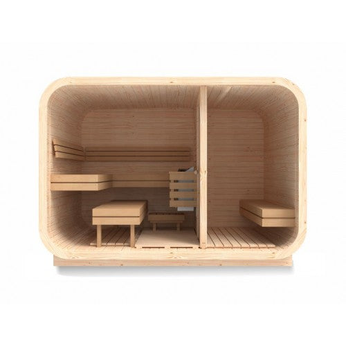 Bastu Kub Stor med omklädningsrum är utformad med dubbla bastulavar för att du ska komma närmre taket där bastun är varmare. Den har en modern design med stora glaspartier av 8 mm härdat & tonat glas, samtidigt som den ger ett bra insynsskydd från baksidan. Bastu Kub Stor är praktiskt utformad med omklädningsrum, för att bekvämt kunna hänga av handdukar och ombyten eller fungera som relaxdel intill bastun. Bastu Kub Stor är byggd av 46 mm nordiskt furutimmer (Thermowood finns som tillval)