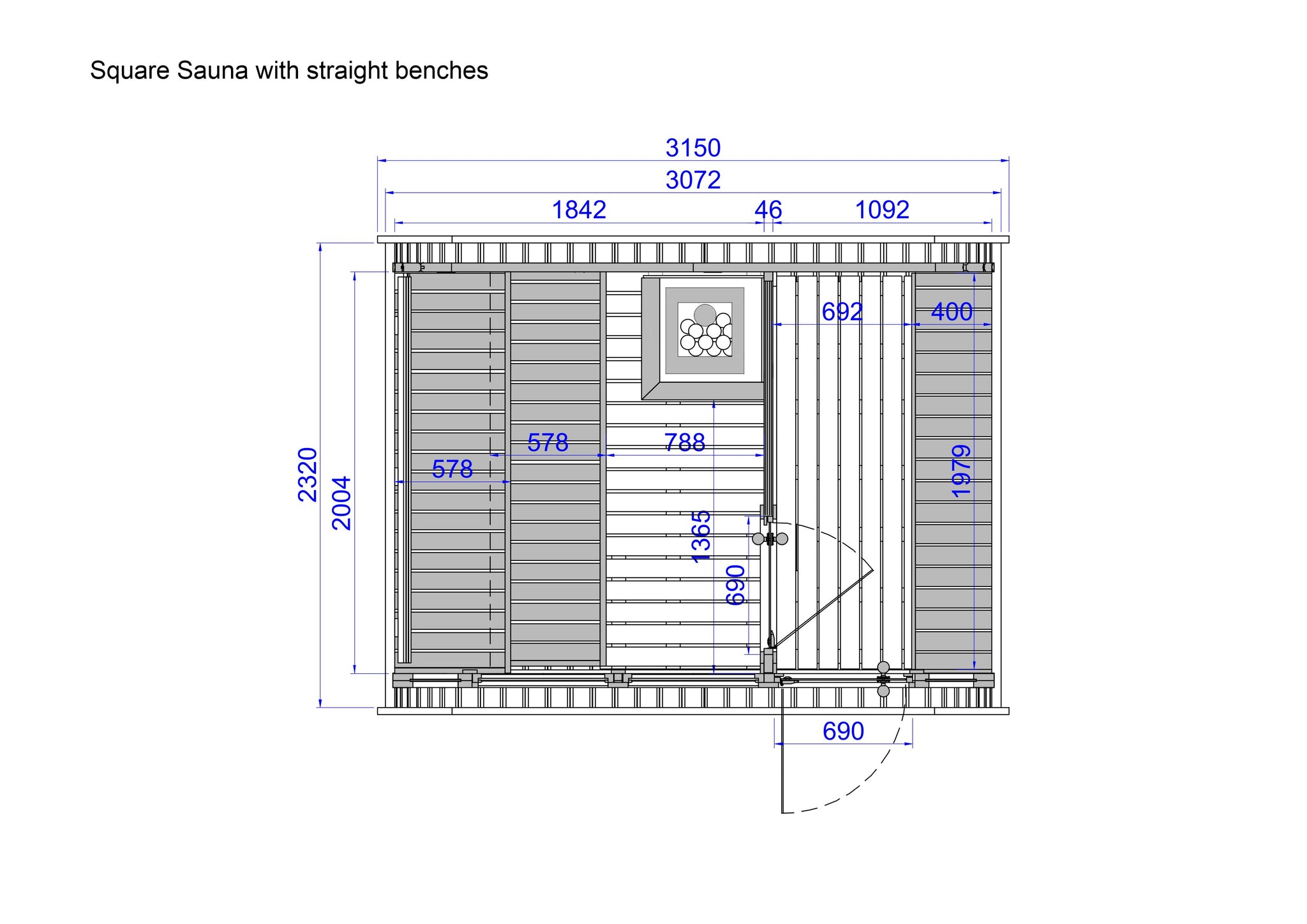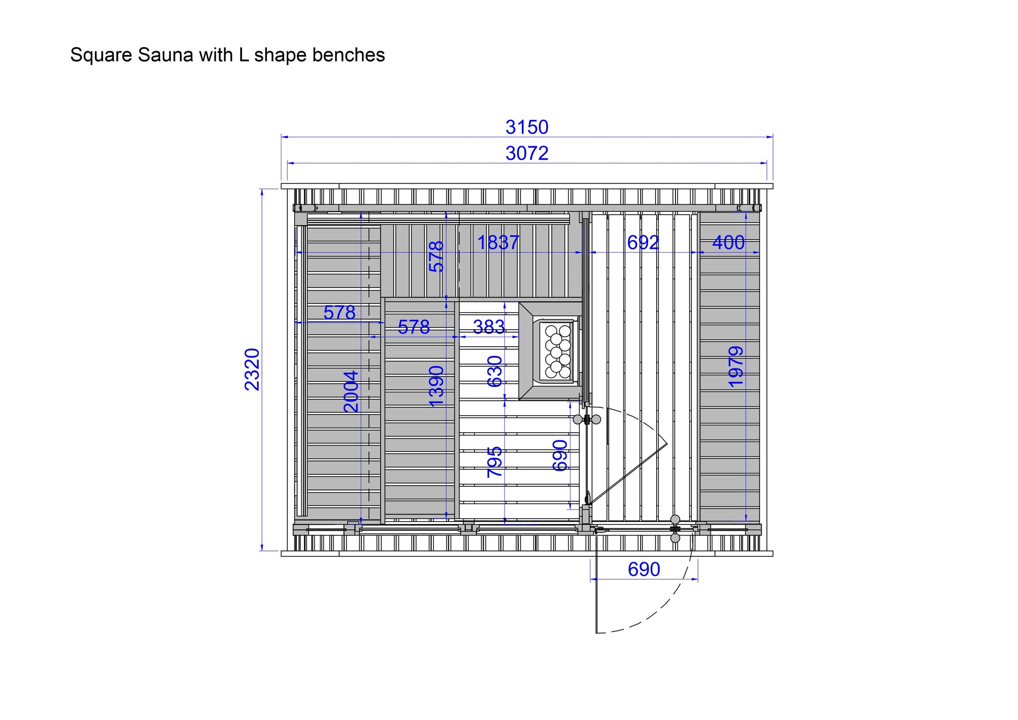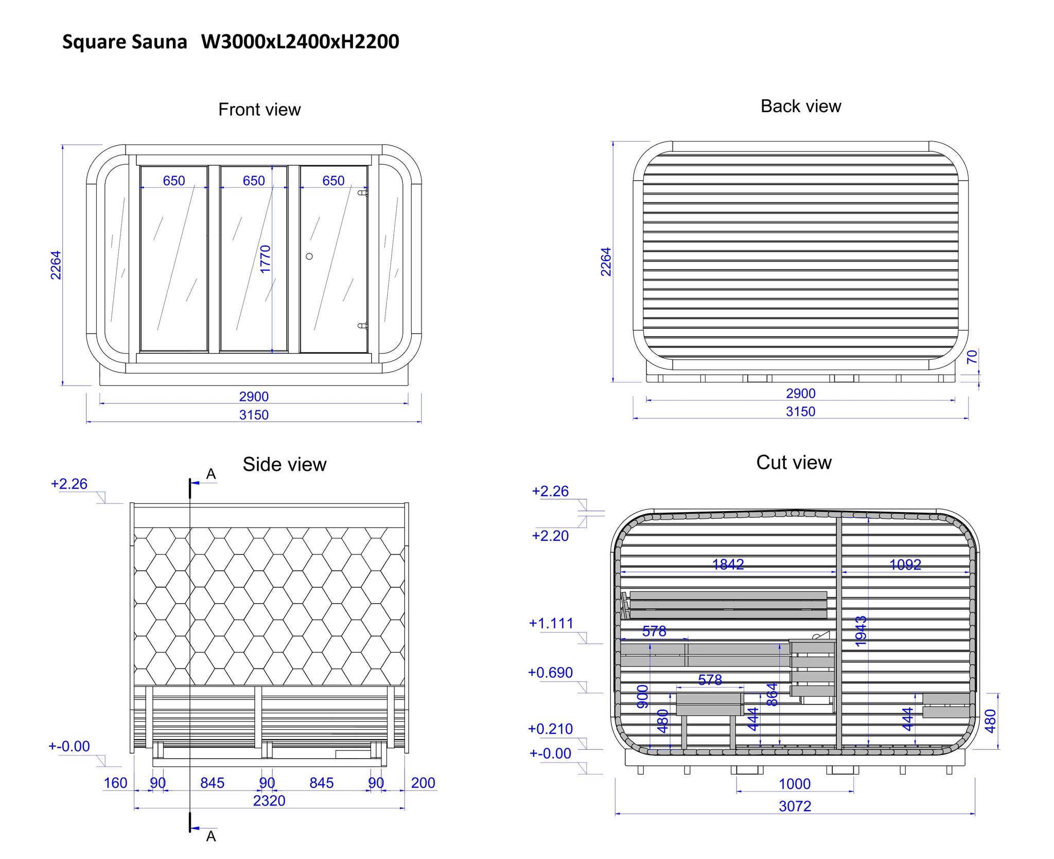 Utvändig storlek Bastu Kub Stor: L: 307 cm x B: 232 cm H: 226 cm